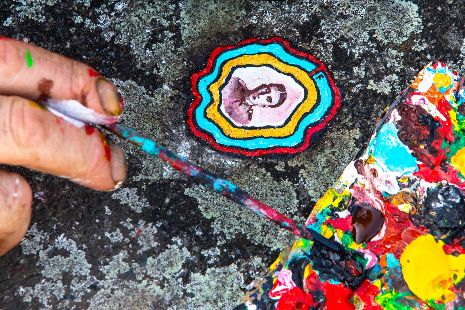 Suffice to say that Wilson’s trademark paintings on splats of disregarded gum are true crowd pleasers. He can spend hours on a single work. The paintings range in styles. There are black and white calligraphic designs with whirling lines and forms that reveal worlds within worlds. Sometimes he’ll opt for a meticulous painterly representation of people and places that he can see from the site where the gum is found. On other occasions he creates fabulous tiny abstract designs that incorporate dedications to folk, texts painted seemingly with a single brush hair that celebrate or commemorate persons, places or events dear to Wilson or are suggested by people who happen across him at work.