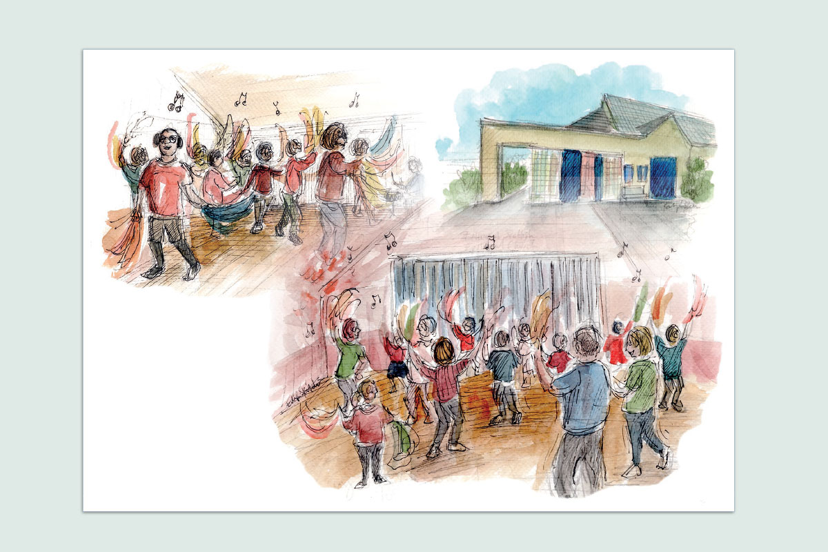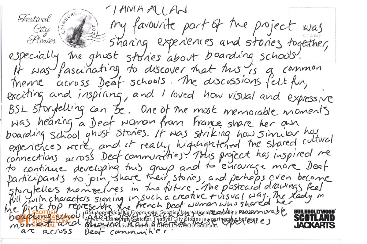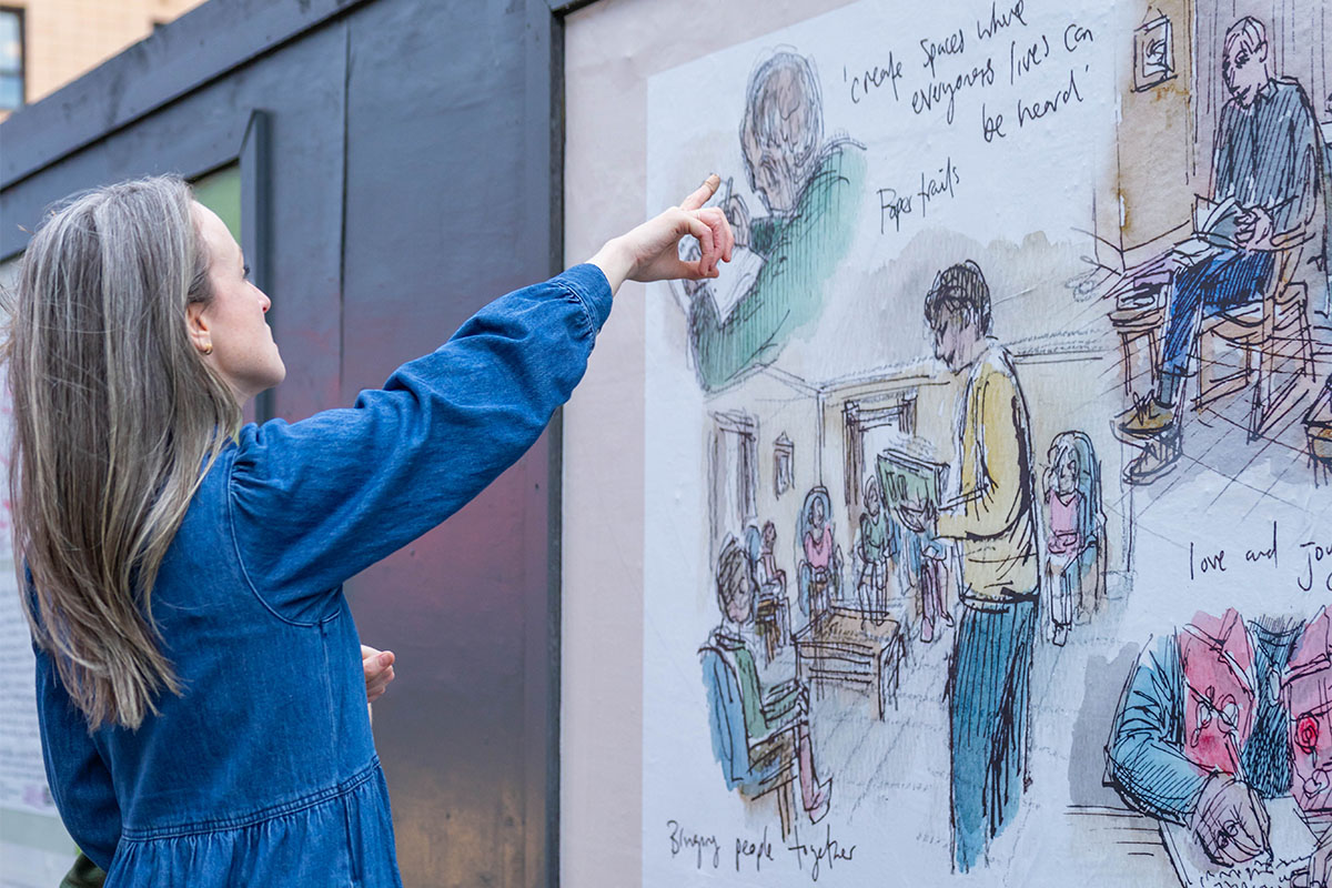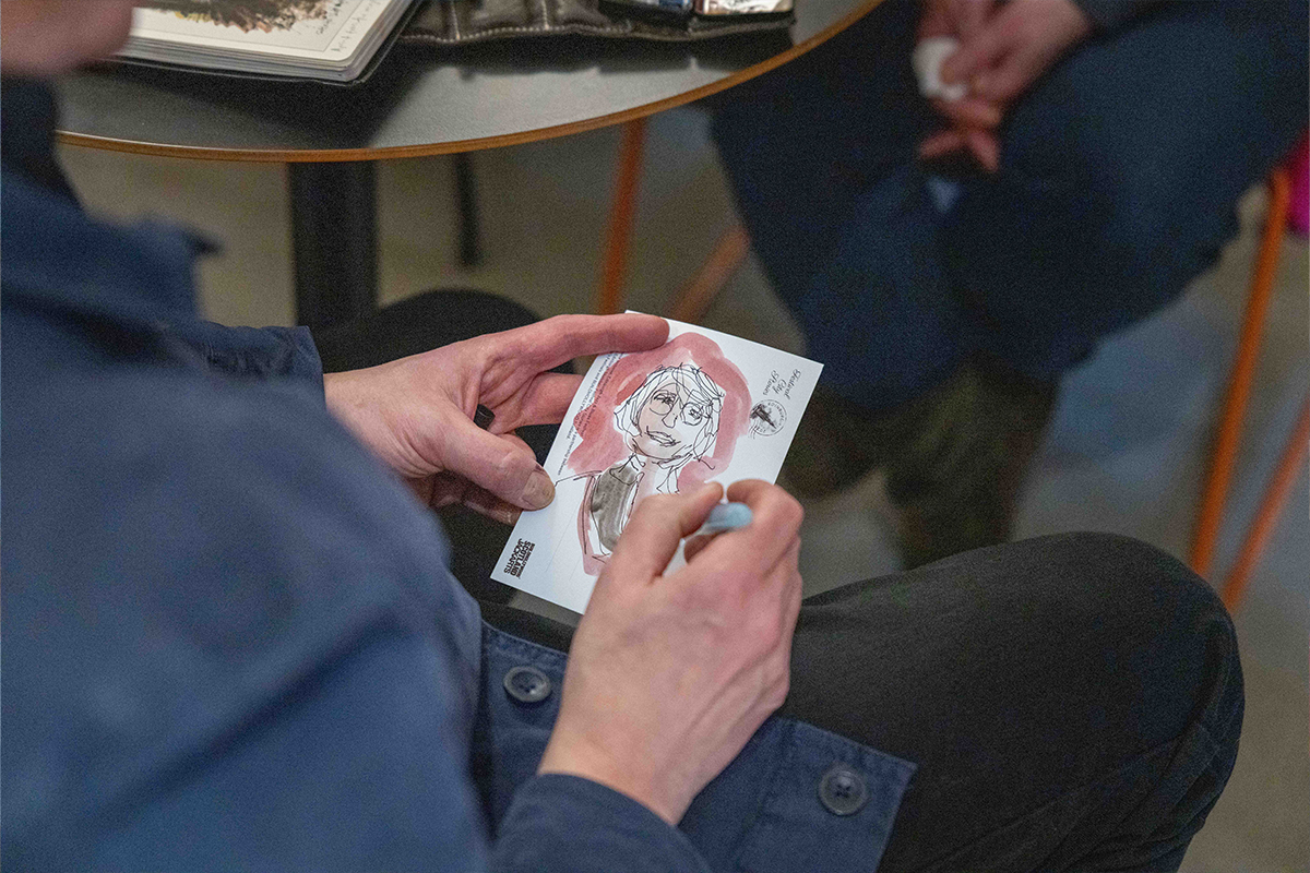 Working with each group, he captured their projects through a series of sketches, which were transformed into postcards for the participants to share their own stories and experiences.