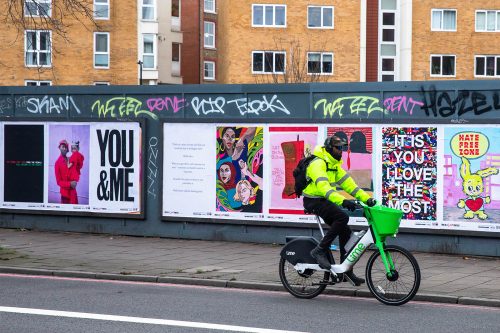 There’s an intriguing aspect to this 2022 archival art trail across the city in that the contemporary display sites either feature in Dimmick’s original photograph or are close by to where he took the pictures. Tying together the past and the present, the displays were celebrated by art walks with the photographer, reflecting on his images and practice in-situ. By means of that comparison we’re able to witness the urban environment in a state of variously paced but constant change. The image 1 White Street, Glasgow (1996) is a subtly textural and tonal composition of an otherwise unprepossessing corner of the city. Its only ‘remarkable’ feature is the hand-painted lightning strike on a street-level dummy window. Nowadays the same building is a garish purple and orange estate agents with a lurid commercial notice where the graffiti bolt used to be.
