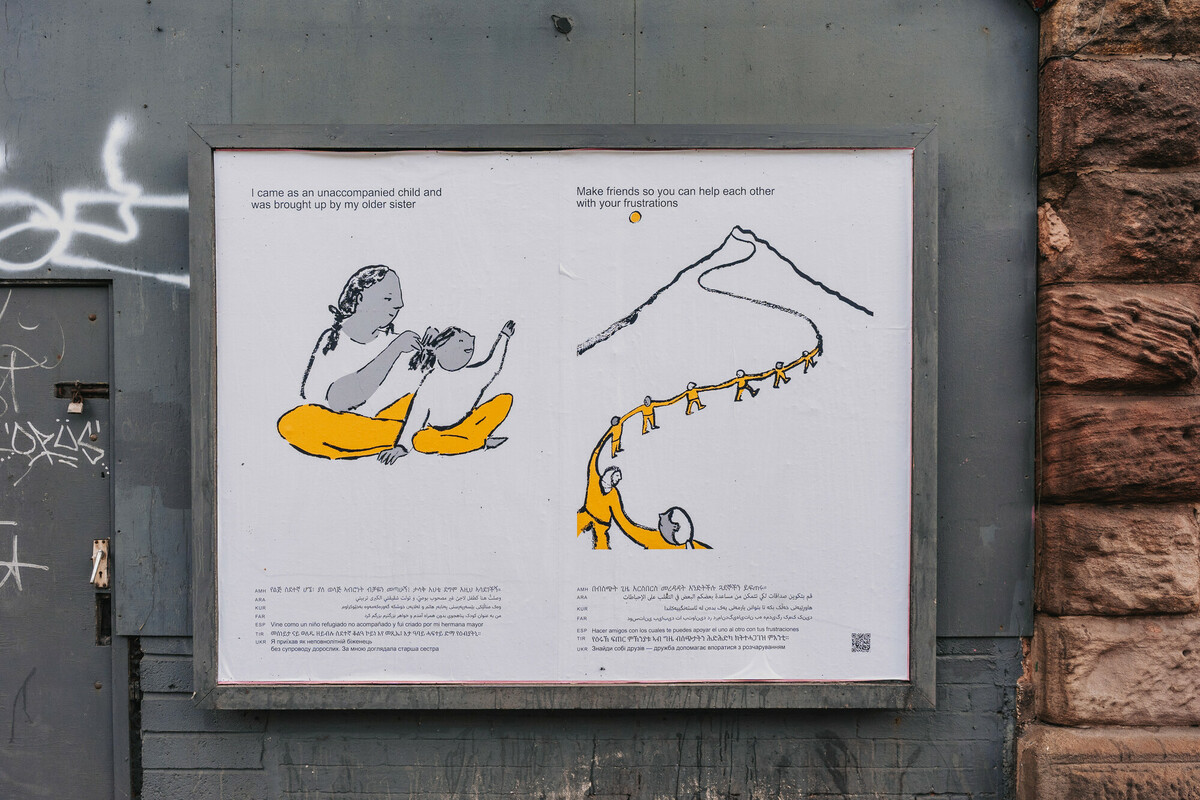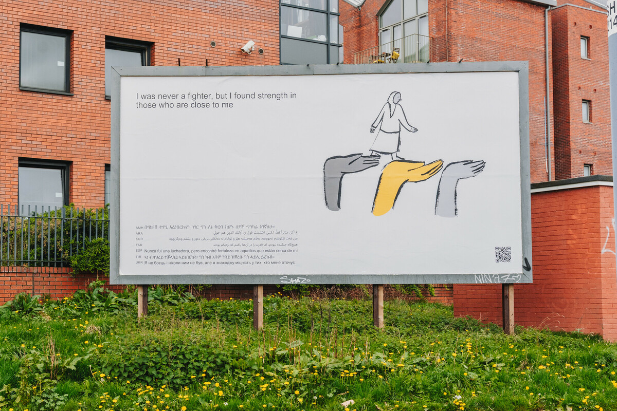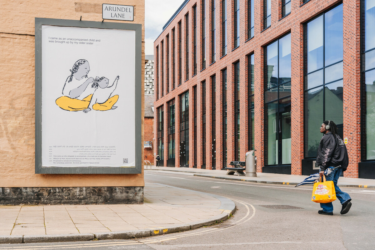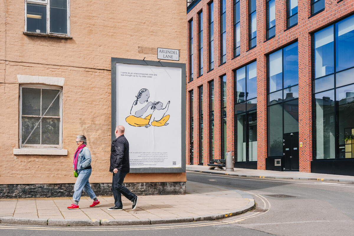 JACK ARTS teamed up with Arts Catalyst to display some of these striking illustrations across the streets of Sheffield through a city-wide poster campaign, inviting passersby to a wonderful multi-lingual exchange of hope, strength, and perseverance.