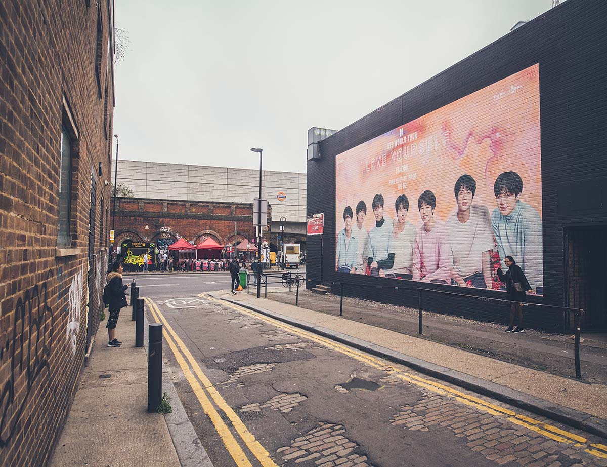 In October 2018, K-Pop mania came to London in the form of boyband BTS. The Korean superstars had embarked on a Love Yourself world tour, including a sold-out two night pitstop in The O2 and, with over 17 million followers on Twitter alone, we knew that the fans would be expecting something a little bit special when their heroes came to town. We worked with Live Nation on this incredible hybrid mural (half paint, half vinyl) in the heart of trendy Shoreditch. Once complete, we popped a shout out with the location on our Diabolical social and, almost overnight, we’d received over 20k likes and 8k re-tweets. Excited fans headed down to create their own content for social media, with their heroes making the perfect backdrop. And to top it off, just around the corner, we organised a huge digital billboard ad to make sure that everyone knew that BTS were in town.
