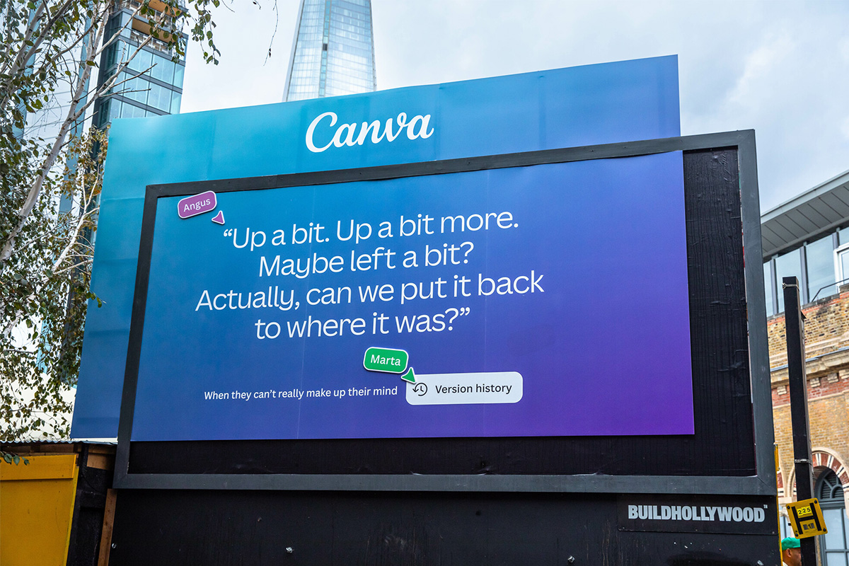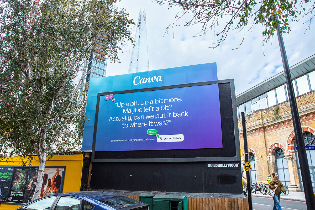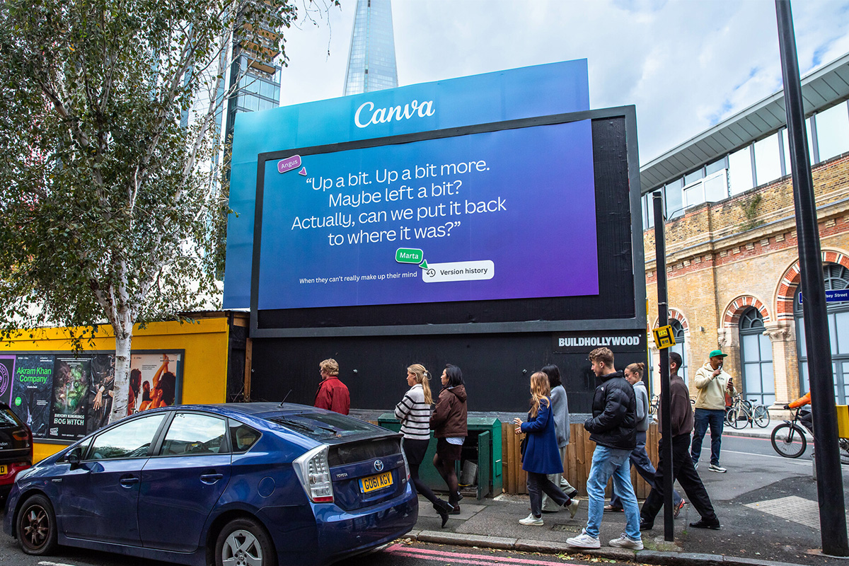 To showcase the world-leading graphic design platform’s new AI capabilities, our creative studio designed a 96-sheet creative billboard with a pixelated logo that morphed into silky-smooth clarity, flexing Canva’s ‘Upscaler Tool’. Additionally, a 48-sheet spill-board turned the heads of passersby, riffing on the pain of indecisive sales teams – saved, of course, by ‘Version History’. The industry noticed too, with Grand Visual and The Drum shouting about the magic we pulled into the real world.