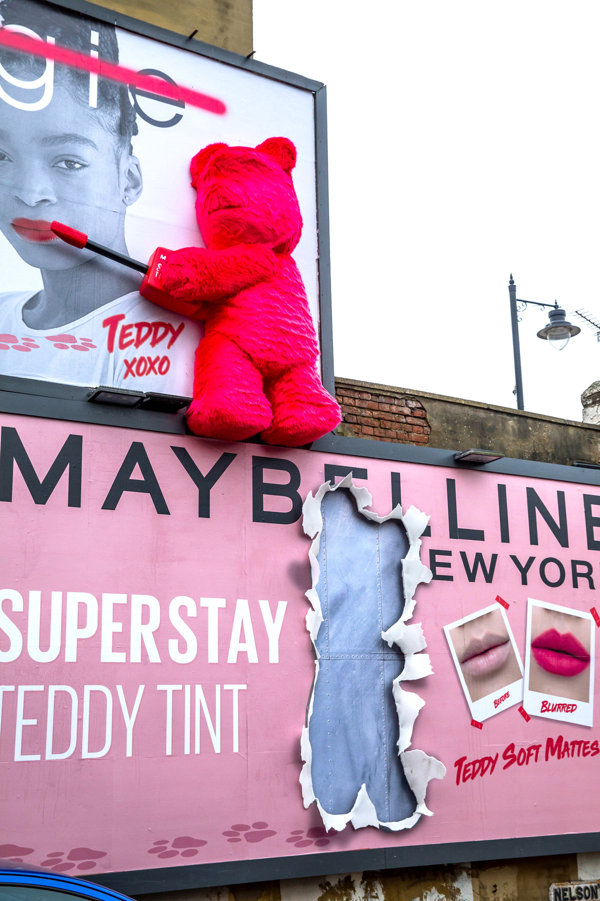 Taking over three of our billboards in Clapham, JACK worked with St Marks Studio on a cheeky creative build that features the pink (unofficial) Maybelline-mascot. The build saw Teddy break out of their 48 sheet confinement to scale the above billboard and ‘fix’ it with their signature blurred effect, proving that everything looks better with the new tint.
