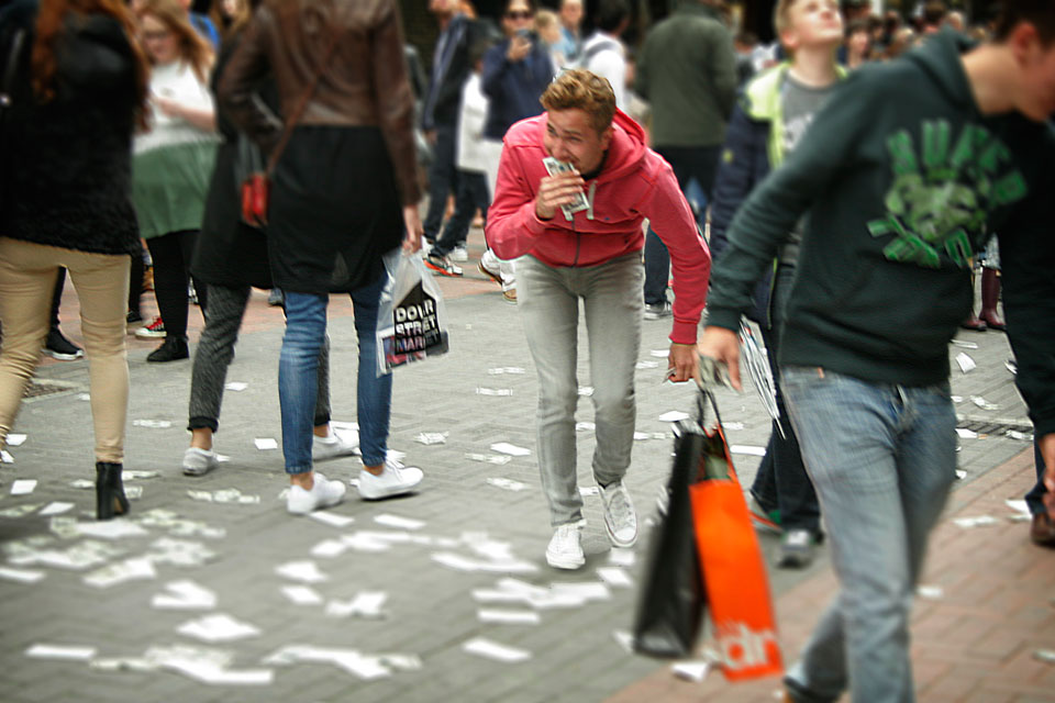 The second phase was a spectacular money drop, whereby thousands of biodegradable bank notes were released from a roof top in Carnaby street London. The look of surprise from the people below, quickly turned into delight as they were seen grabbing the money from the sky.