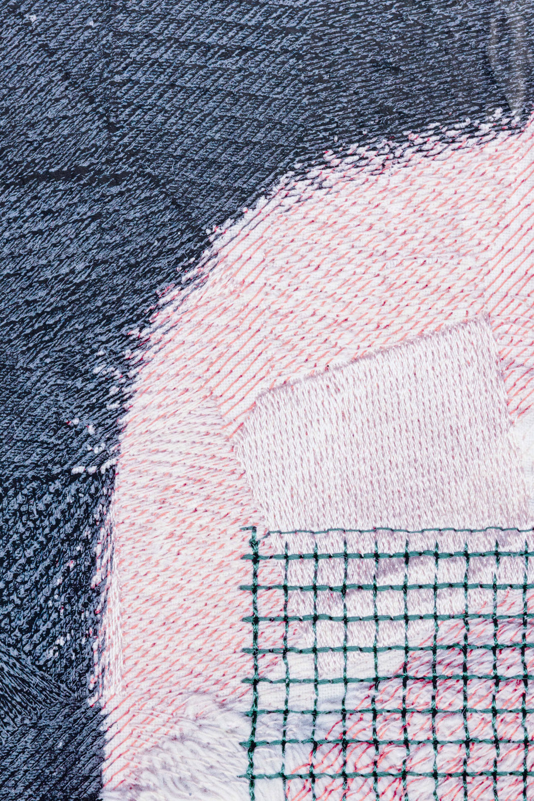 Exploring the intersections of textiles, printmaking and archival research, Glasgow-based artist Poppy Nash’s latest work builds upon Disobedient Textiles, a research project in which Nash engaged archives and curators to investigate objects crafted by incarcerated women. Nash connects her practice with theirs by integrating text and motifs from their objects into layers of salvaged fabric scraps, digital embroidery, and screen printing.