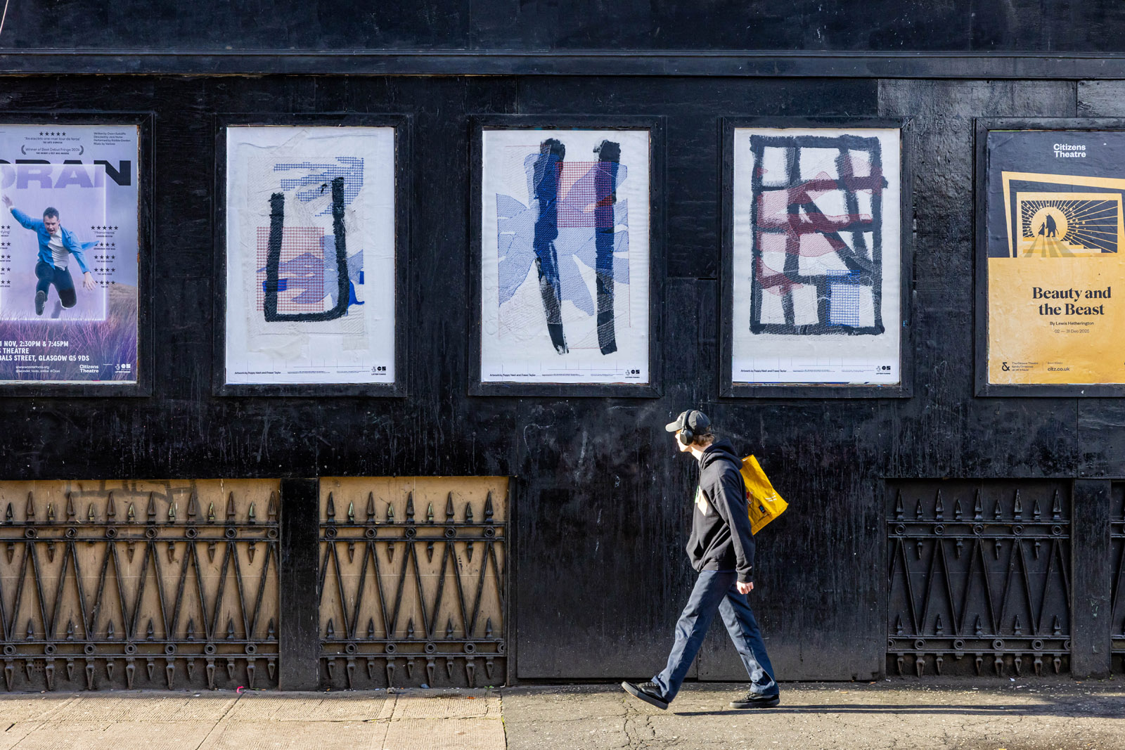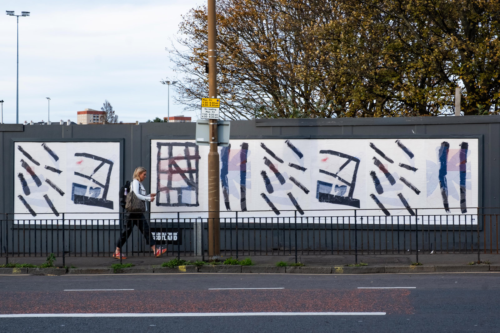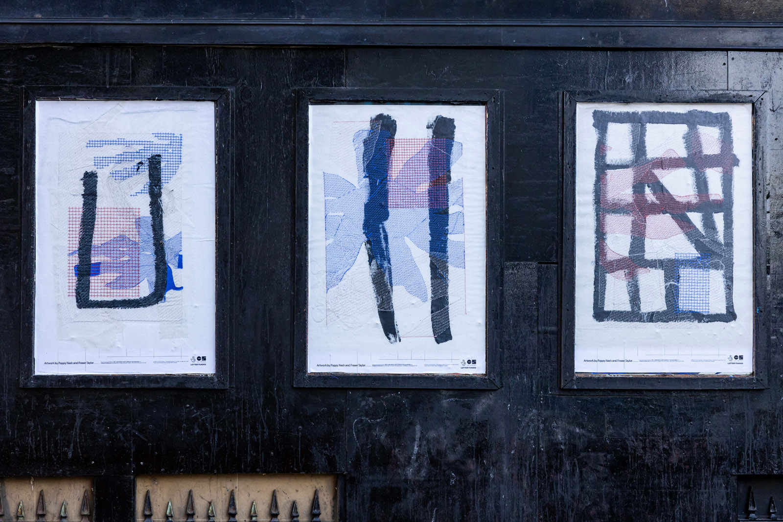 JACK ARTS Scotland partnered with Nash and Taylor to take their new collaborative works to our sites across Edinburgh and Glasgow, ahead of their parallel solo exhibitions SEE / AND KNOW BOTH SIDES OF THE QUESTION and Unlikely Architectures at Patriothall Gallery in Edinburgh. Combining Taylor’s distinctive black lines with Nash’s textural embroidery the pair have overlaid their work to mimic the process of layering within screen printing. This series of nine new collaborative works bridge the intersections of their practices, bringing graphic marks and soft textures to public sites across the two cities.
