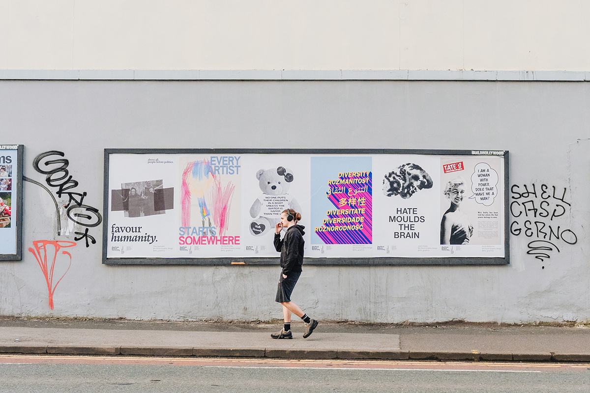 In response to a flyingleaps talk hosted by BUILDHOLLWOOD’s Senior Arts Coordinator, Adrian Burnham, about the conception, production and display of posters seeking to capture our attention on the streets, this year’s cohort of L4 Graphic Design students created these visual invitations to pause and engage with our surroundings.