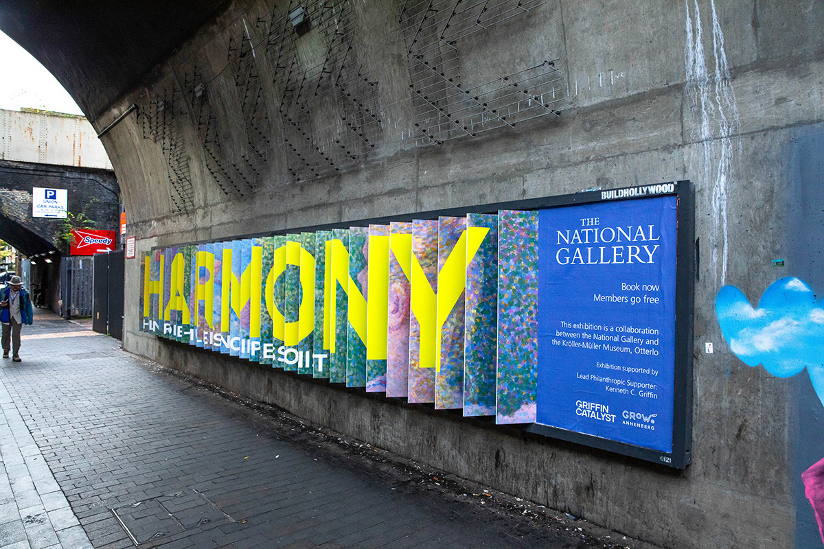 Playing on the exhibition’s themes of perspective and contrast captured in the title Radical Harmony, JACK ARTS teamed up with Posterscope to bring the concept to life on the streets with a 3D lenticular billboard. This dynamic installation allowed passersby to see shifting visuals and messages depending on their viewing angle, echoing the Neo-Impressionists’ exploration of perception.